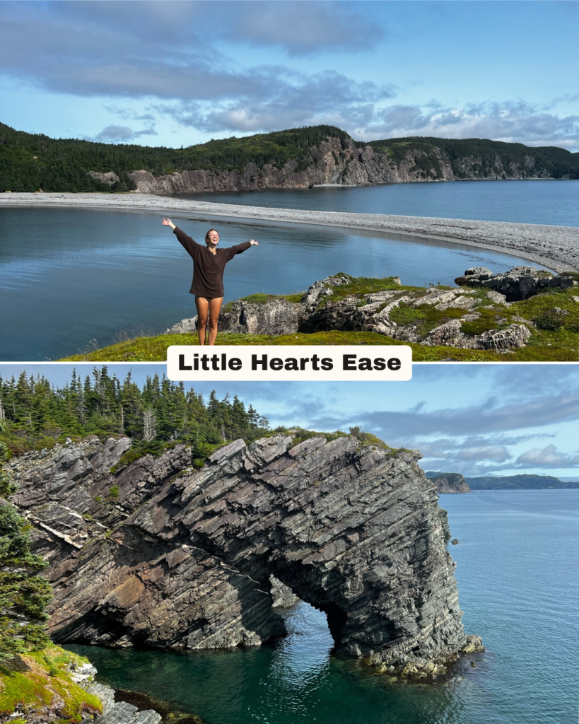 Only a 40-minute drive from Clarenville is Little Heart’s Ease Beach. This place is as accurate as the name might suggest. It is a thin beach with the ocean lapping on both sides. If you walk the beach to the headland, you can hike a short loop trail that displays 360-degree views of the ocean and a rugged coastline of cliffs, including a sea arch.